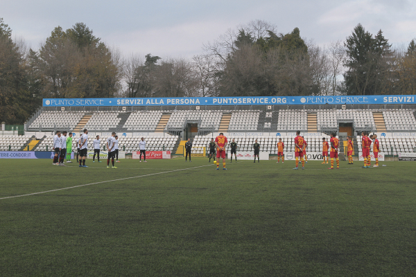 PRO VERCELLI ALBINOLEFFE MINUTO SILENZIO PAOLO ROSSI / VERCELLI – Prima del fischio d’inizio di Pro Vercelli-Albinoleffe, le due squadre hanno rispettato – come su tutti gli altri campi – un minuto di silenzio per commemorare la scomparsa di Paolo Rossi. Ecco, nella foto di Ivan Benedetto, le due squadre a centrocampo al “Silvio Piola”: